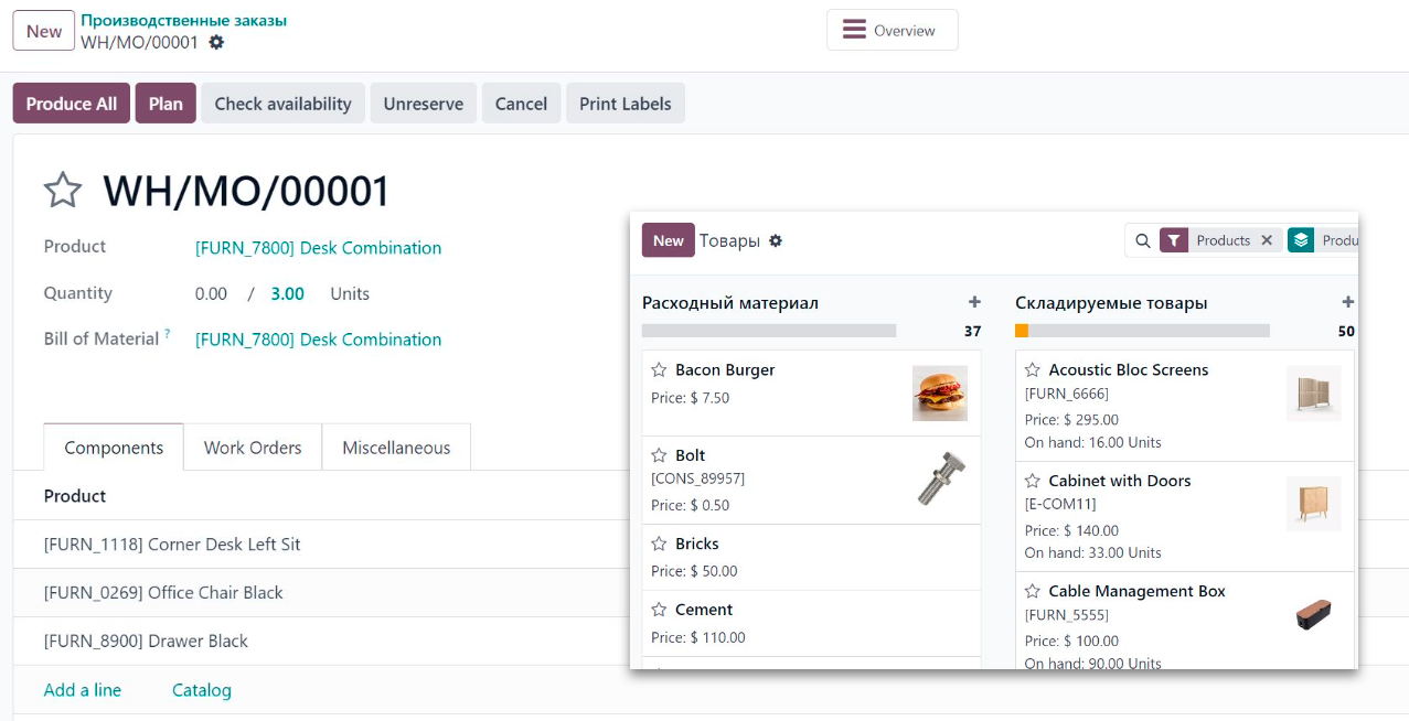 The manufacturing suite includes MRP, PLM, Quality, and Maintenance modules, enabling you to manage the full production cycle in a single system: